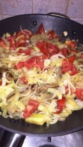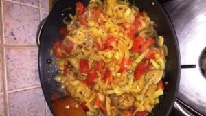 A májat 1 cm vastagságúra vágjuk, majd zsírjára sütjük. A zsírt leszedjük, amennyire tudjuk. A zöldséggel átforgatjuk, sütjük még pár percig. Jázmin rizzsel tálaljuk.A végen szórjunk rá flekken port…úgy a családnak is jobban ízlik. Tálalás után sózzuk ízlés szerint.