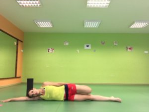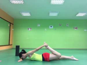 Oldalfekvésben a felül lévő lábad hajlítsd be, és fogd meg a bokád / lábfejed, és húzd a popsidhoz. A két comb párhuzamos marad, egymás mellett. Tartsd meg ezt a pozíciót minimum 30 mp-ig, de akár tovább is!