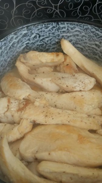 A hússal kezdem a főzést. Négyünknek két egész csirkemell az induló adag, a csontja majd a holnapi levesbe megy, a husi pedig felcsíkozva a forró olívaolajba. Jobb napokon hagymát is vágok alá, de ma inkább kihagytam. Amíg kifehéredik és levet ereszt, nem keverem, mert kicsit pirítani szeretném.