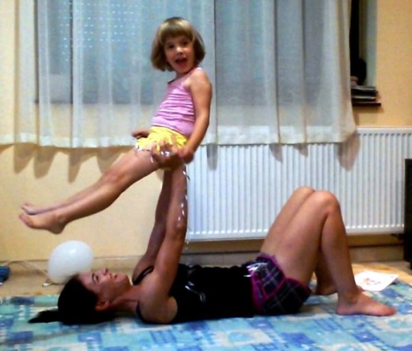 A gyerekkel való hancúrozásba is nagyon jól bele illeszthető 🙂 Élő kis súlyzóid lehetnek ők úgy, hogy mindannyian élvezitek. Itt csak az a fontos, hogy ne döntsd előre, hogy miből és mit fogsz csinálni – mert akkor már oda az élvezet.